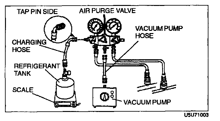 2. Connect the tap pin side of the charging hose to the air purge valve of the manifold gauge.