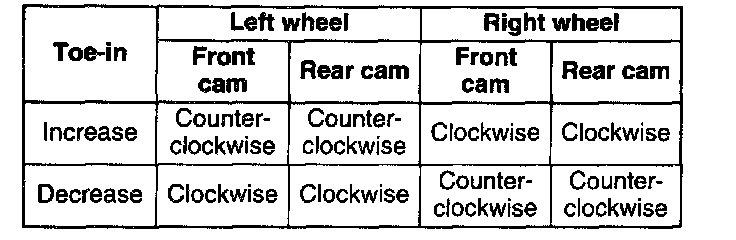 Note: Turning the front cam one graduation changes the toe-in about 2.3 mm (0.1 inch) and the camber about 13'. Turning the rear cam one graduation changes the toe-in about 2.3 mm (0.1 inch) and the camber about 8'.
