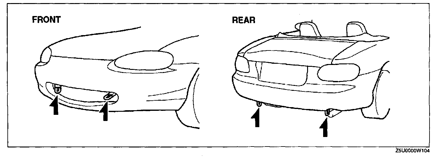 CAUTION: Do not use the hook loops under the front and rear for towing. They are designed ONLY for tying down the vehicle when it is being transported. Using them for towing will damage the bumper.