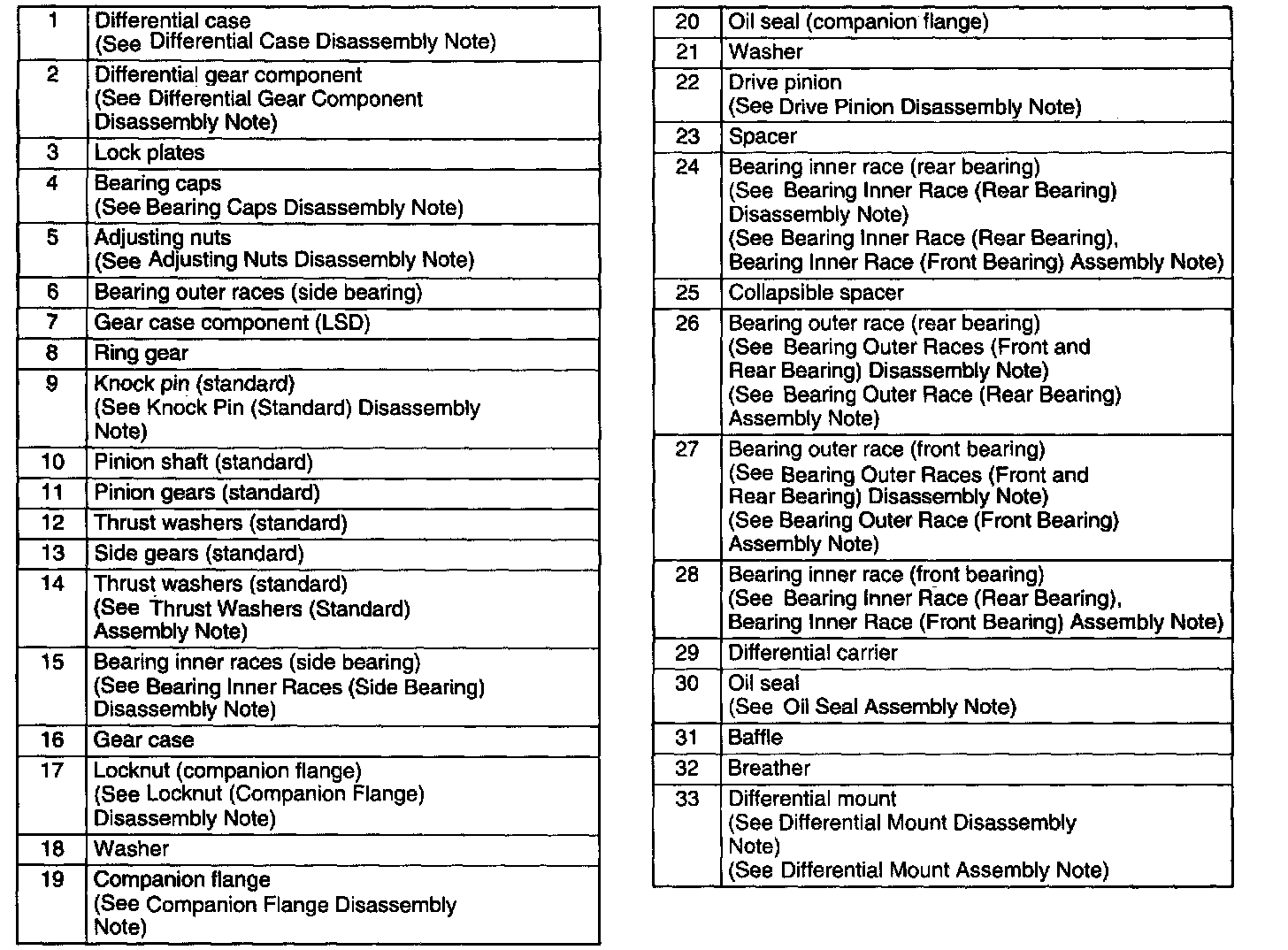 DIFFERENTIAL DISASSEMBLY/ASSEMBLY1. Disassemble in the order indicated in the table.