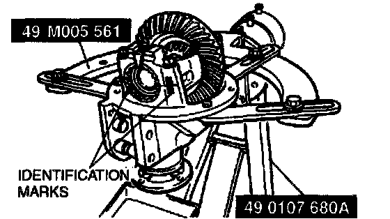 8. Install the differential bearing caps, making sure that the identification mark on the cap corresponds with the one on the carrier, using the SST. Then temporarily tighten the bolts.