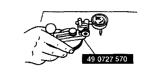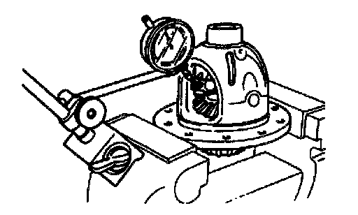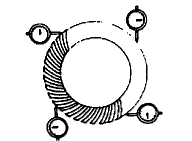 1. Mark the ring gear at four points at approximately 90° intervals. Mount a dial indicator to the carrier so that the feeler comes in contact at a right angle with 1 of the ring gear teeth.