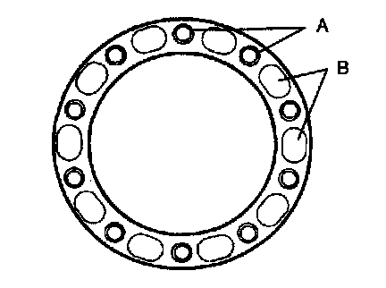3. Apply thread-locking compound to bolt threads A and points B of the gear back face. Apply approximately 0.04 cm3 (0.04 cc, 0.0024 cubic Inch) of thread-locking compound at each point and bolt thread.