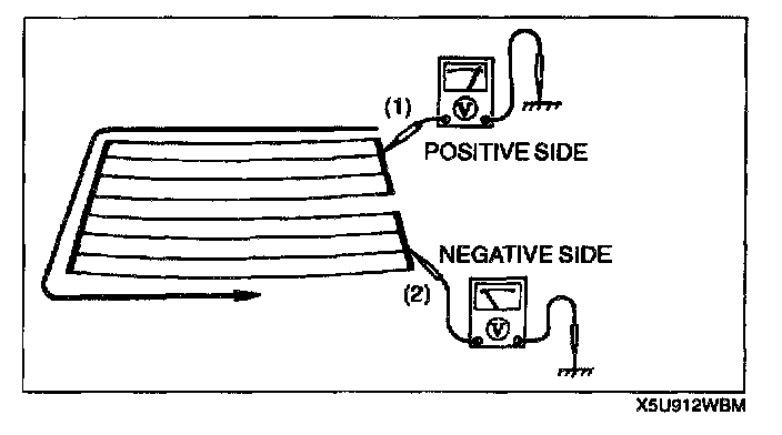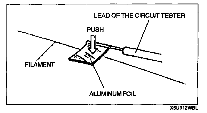 CAUTION: Directly touching the rear window defroster filament with the lead of the circuit tester will damage it. Wrap aluminum foil around the end of the lead and test the filament by touching it with the foil.