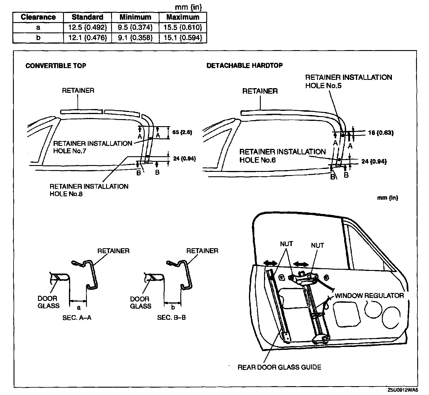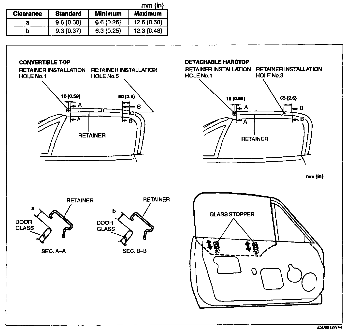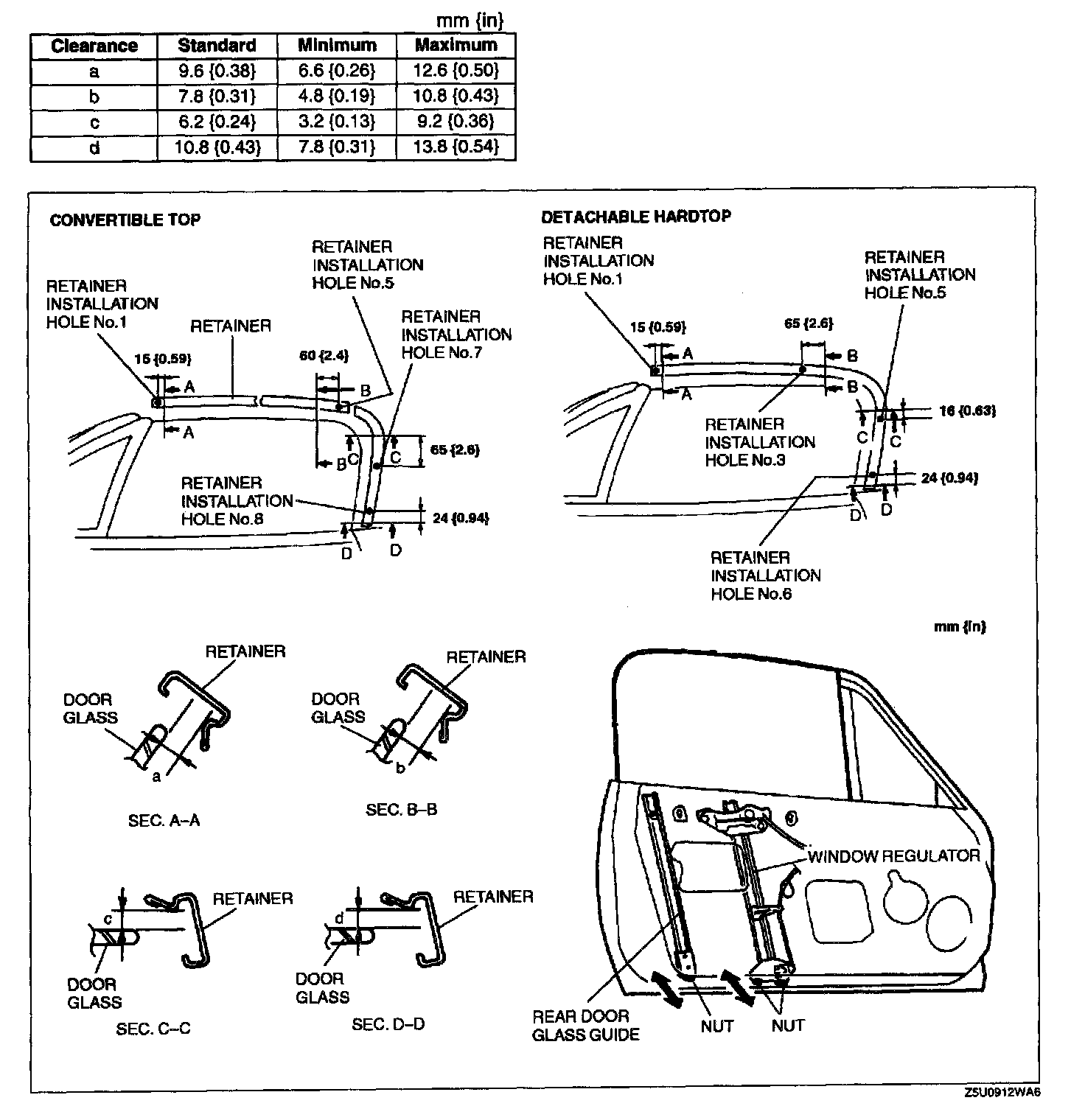NOTE: The front retainer installation hole is named retainer installation hole No.1, and the bottom hole is named retainer installation hole No.8 (convertible top) or retainer installation hole No.6 (detachable hardtop).