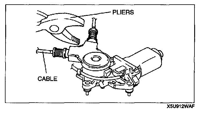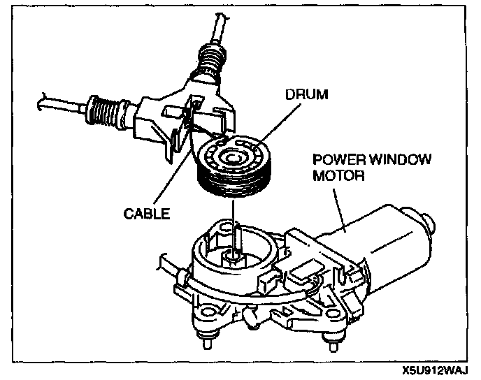 5. Assemble into the power window motor. Taking care to prevent the cable from getting caught between the drum and the motor and the motor housing, carefully assemble the cable onto the upper bracket pulley.