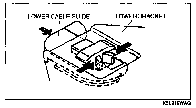 6. Verify that the ends of the cables are inserted into the adjusting bolts, shift the lower cable guide until a clicking sound is heard, and assemble to the lower bracket.