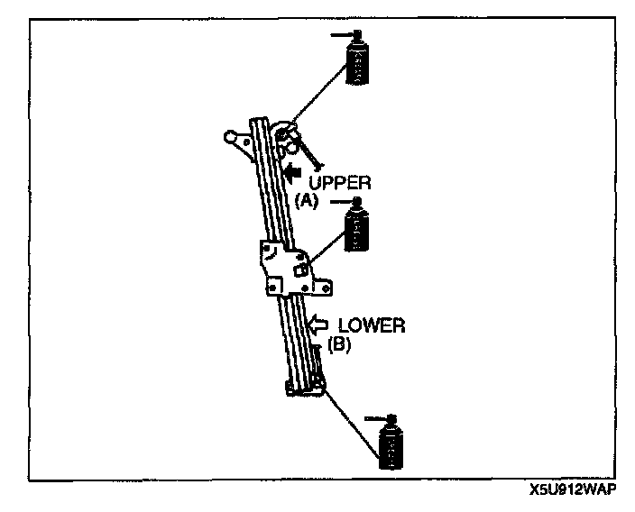 9. For the upper part, pull the (A) part of the cable and for the lower part, pull the (B) part of the cable, and adjust the adjusting bolts making sure the coil springs don't bend.