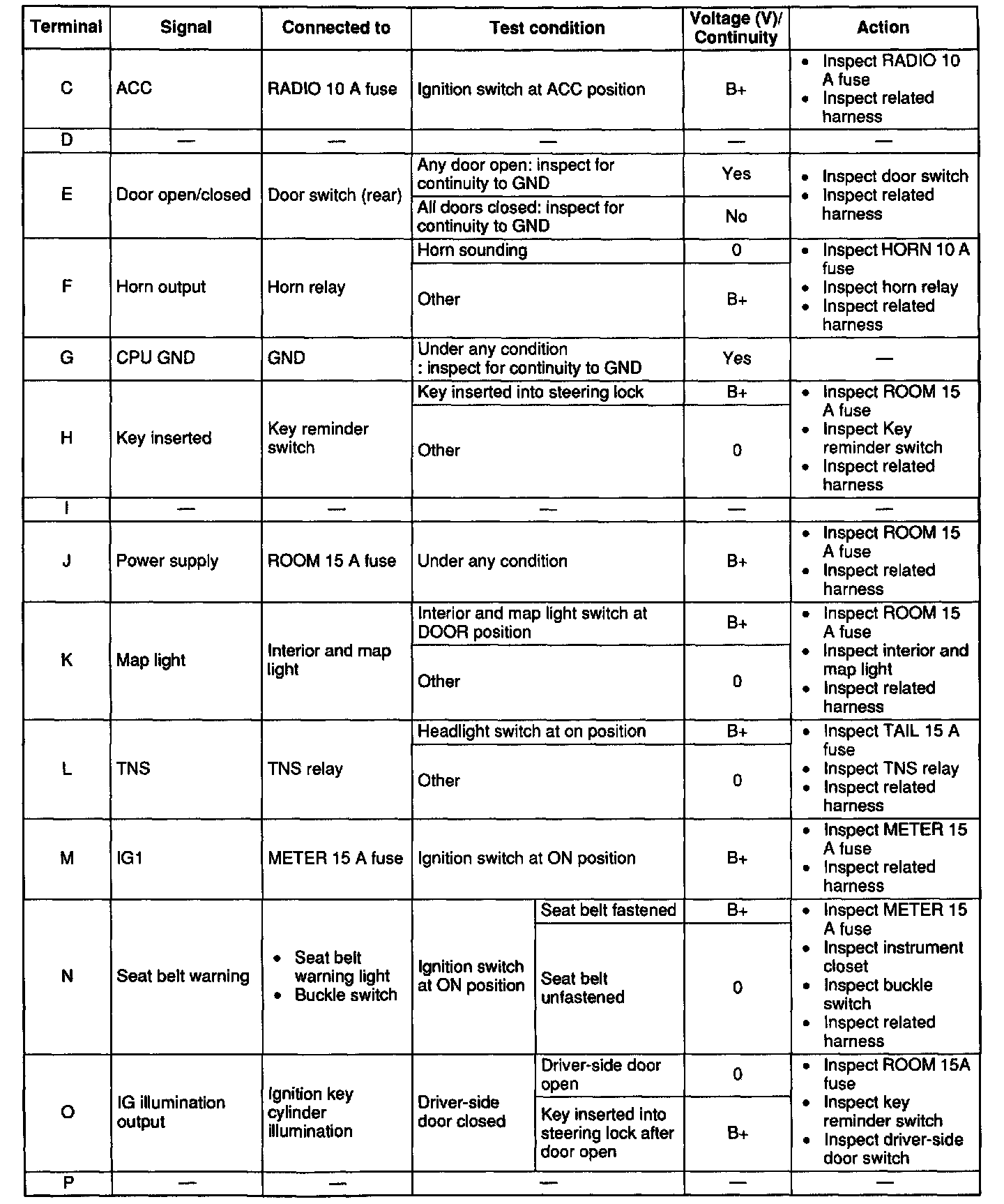 - If not as specified, inspect the parts listed under "Inspection area" and the related wiring harnesses.