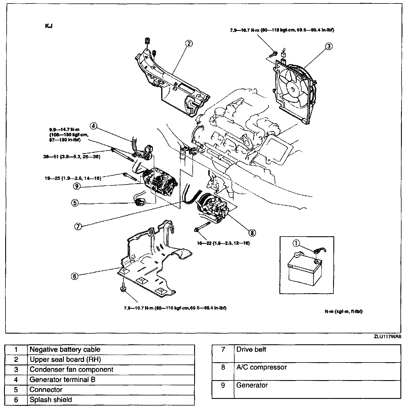 - Disconnecting generator terminal B before disconnecting the negative battery cable can damage the generator harness and connector.