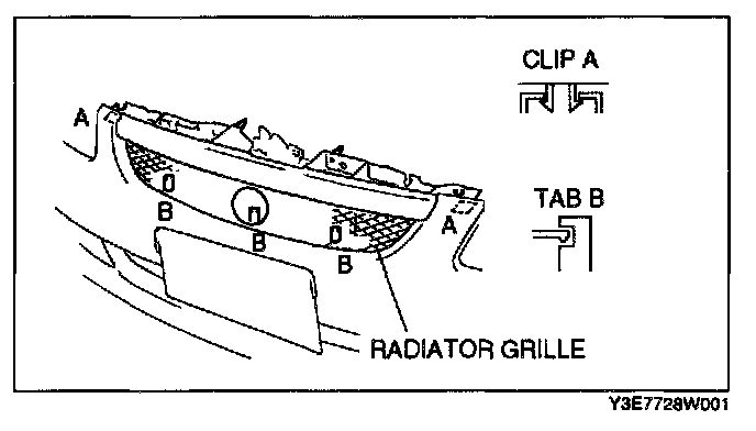 Pull the radiator grille forward to disengage clips A and tabs B from the front