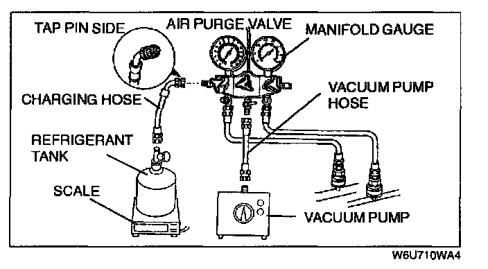 CAUTION: Close the manifold gauge valve immediately after stopping the vacuum pump. If the valve is left open, the vacuum pump oil will back flow into the refrigeration cycle and cause a decrease in the efficiency of the air conditioner.