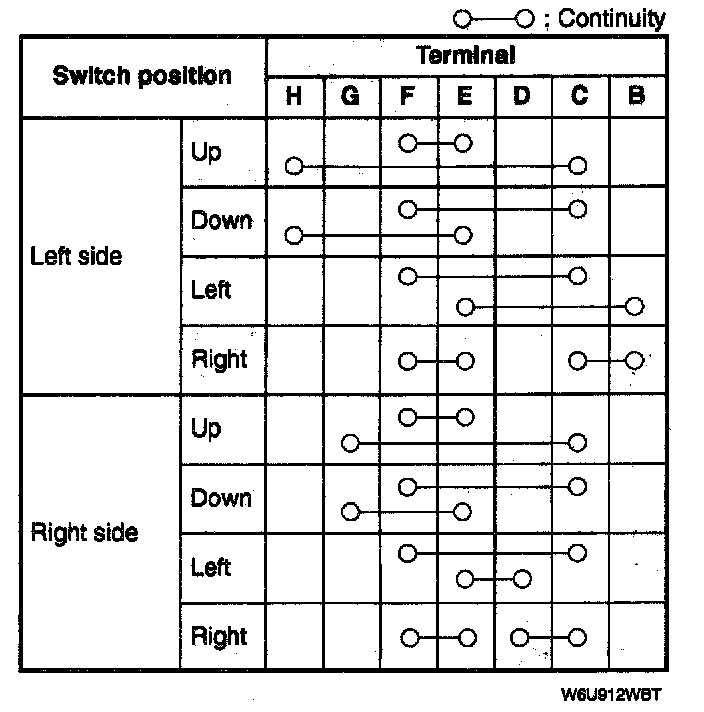 2. Inspect for continuity between the power outside mirror switch terminals by using an ohmmeter.