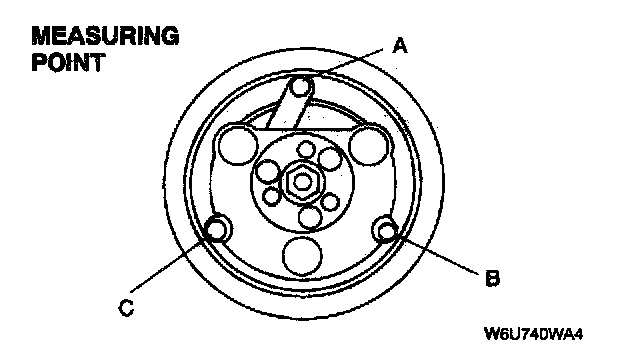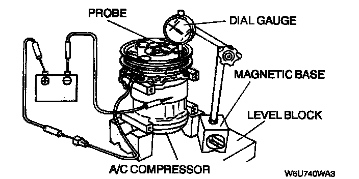4. Turn off the magnetic clutch by disconnecting the ground from the A/C compressor body, then measure the dial gauge readings.