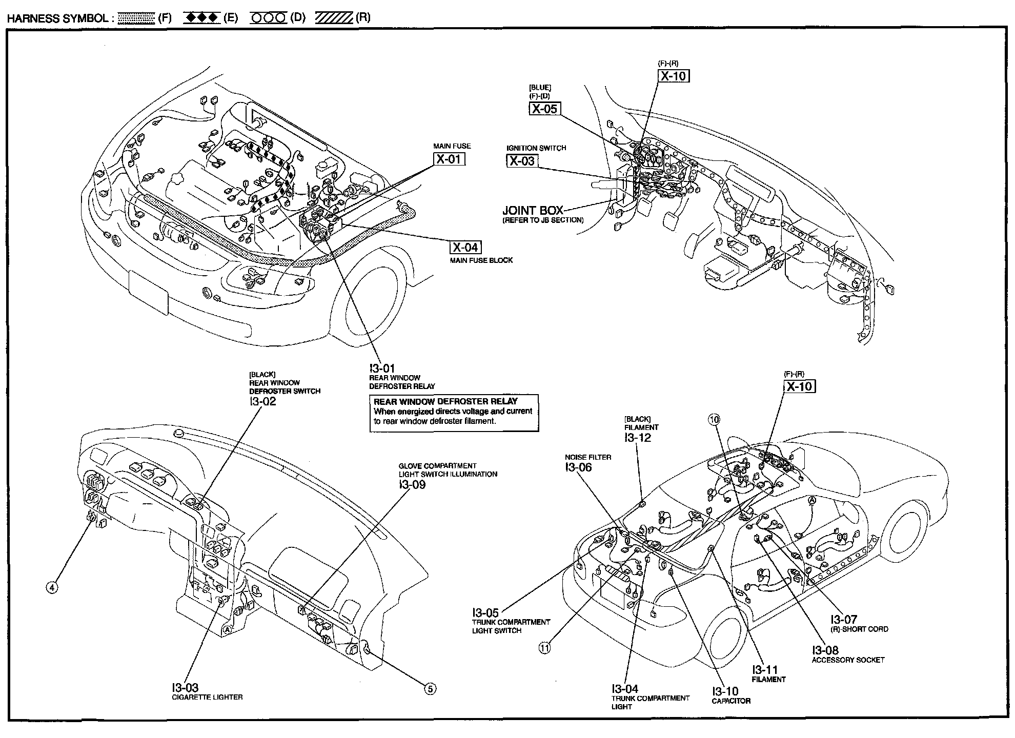 I-3 - Accessory Socket/Cigarette Lighter/Glove Compartment Light/Rear Window Defroster/Trunk Compartment Light Harness/Connector Symbols: