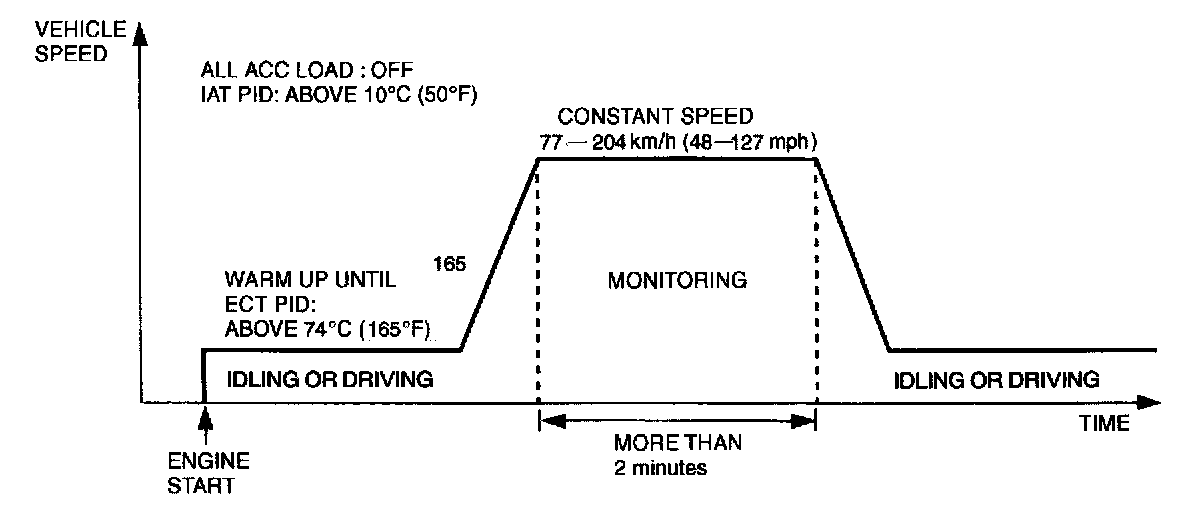 4. Drive vehicle within 77 - 204 km/h {48 - 127 mph} and maintain a constant speed for at least 2 minutes.