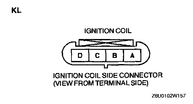 2. Measure the insulation resistance between terminal B (FS) or D (KL), and ignition coil case using an ohmmeter.