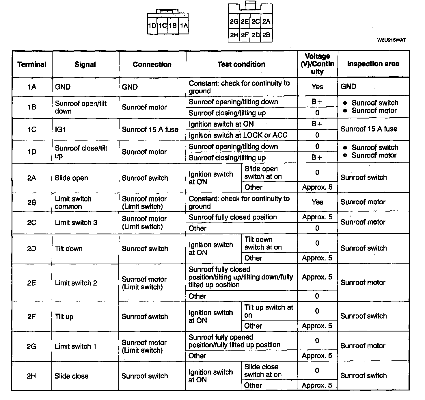 4. Disconnect the sunroof control module connector before checking for continuity at terminal 1A and 2B.