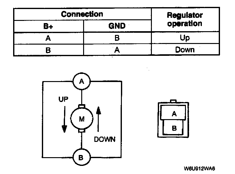 5. Apply battery positive voltage to the rear power window regulator terminals and check the operation of the rear power window regulator.