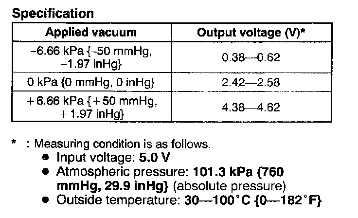 6. Decrease the applied pressure from +6.66 kPa {+50 mm Hg, +1.97 inHg} to -6.66 kPa {-50 mm Hg, -1.97 in Hg} and verify that the PCM terminal 62 voltage decreases accordingly as specified.