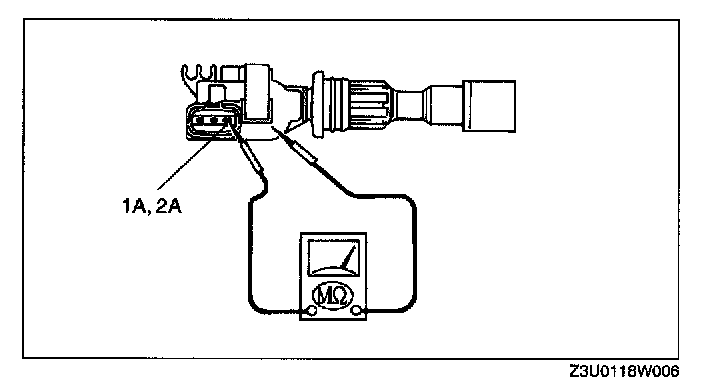3. Measure the insulation resistance from terminal 1A to ignition coil case, and terminal 2A to ignition coil case using an ohmmeter.