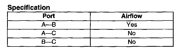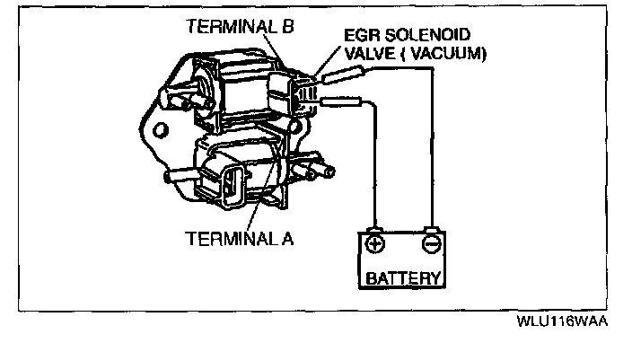 2. Apply battery positive voltage to terminal A and ground terminal B of the EGR solenoid valve (vacuum). Verify that air flows as shown.