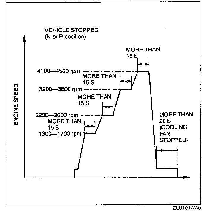 3. Perform no load racing at the engine speed shown in the graph, then idle the engine for more than 20 s after the cooling fan stopped. If possible, monitor RPM PID for engine speed and cooling fan status during this procedure.