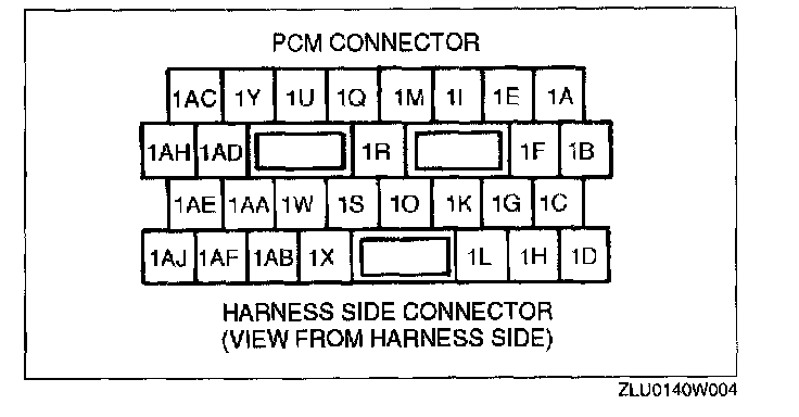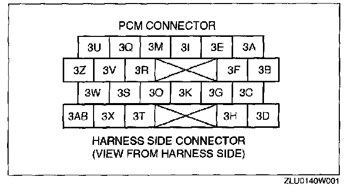 4. Verify there is continuity between the PCM connector terminal 3A and each sensor connector terminals such as TP sensor and others, which is applied to Vref.