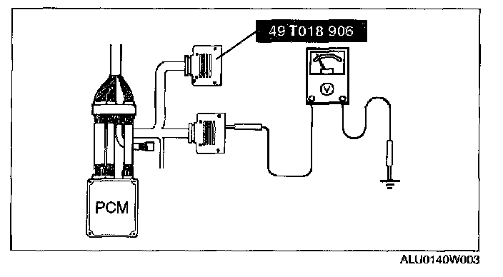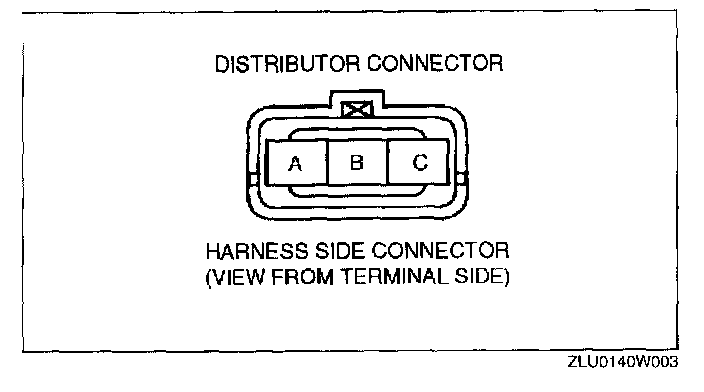 6. Measure the terminal voltage between the distributor connector (3-pin) terminal A and body ground using a voltmeter.