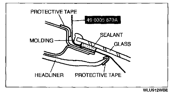 5. Apply primer to the bonding area of the molding, glass, and body using a brush. Use only glass primer on the glass, and body primer on the body and molding. Keep the area free of dirt and grease, and do not touch the surface. Allow it to dry for approximately 30 minutes.