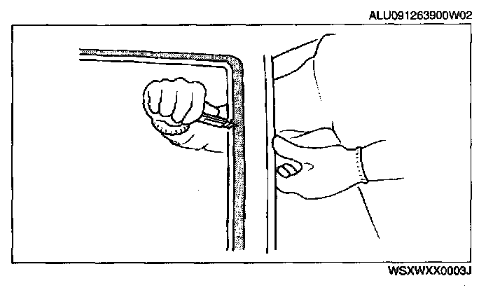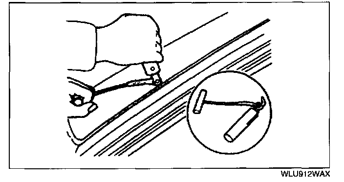15. Working with another person, saw through the sealant around the edge of the glass. Use a long sawing action to spread the work over the whole length of wire to prevent it from breaking. Make sure the wire does not rub on the body or the dashboard.
