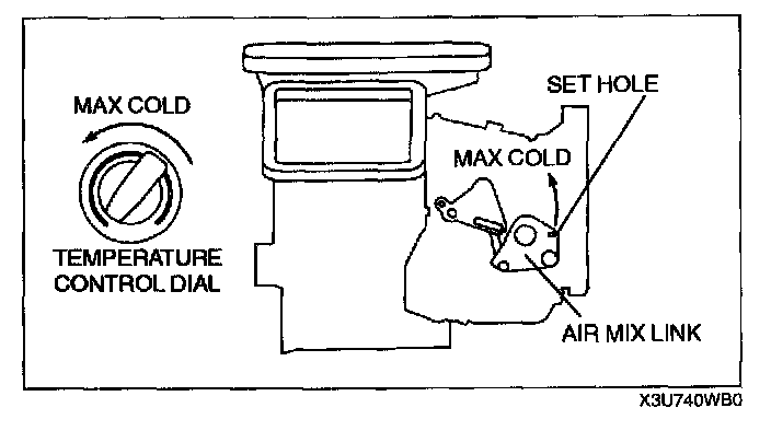 2. Set the air mix link to max cold in the direction shown by the arrow and insert a screwdriver at the set hole.