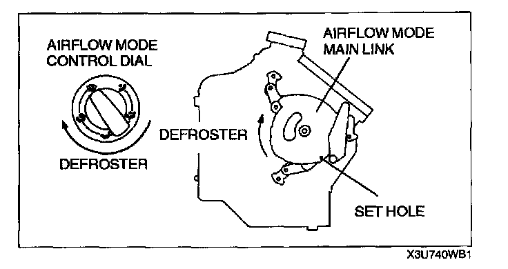2. Set the airflow mode main link to defroster in the direction shown by the arrow and insert a screwdriver at the set hole.