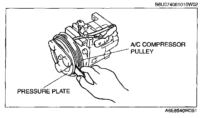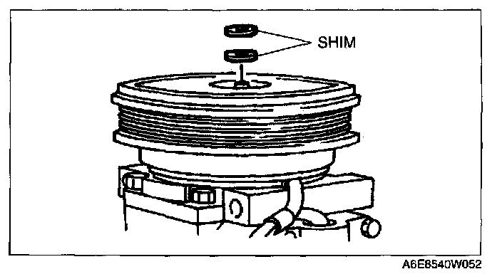 MAGNETIC CLUTCH ADJUSTMENT1. Measure the clearance around the entire circumference between the pressure plate and A/C compressor pulley using a thickness gauge.