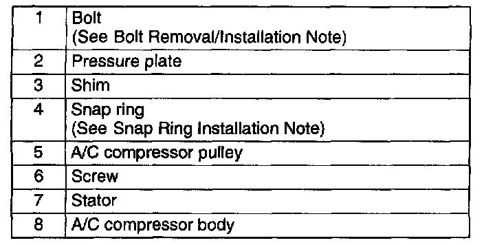 1. When installing a new pressure plate, A/C compressor pulley, stator, or A/C compressor body, replace the snap ring.