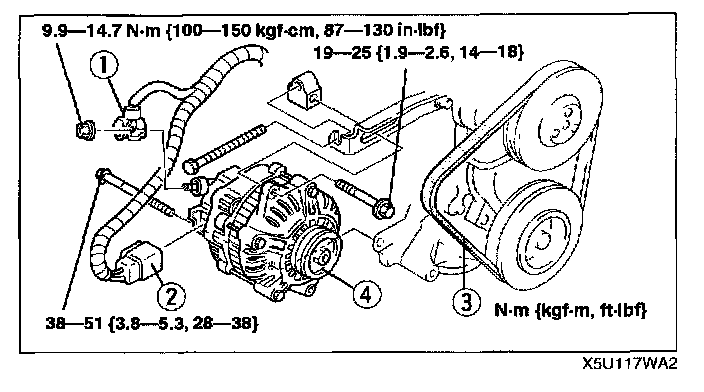 WARNING: When the battery cables are connected, touching the vehicle body with generator terminal B will generate sparks. This can cause personal injury, fire, and damage to the electrical components. Always disconnect the battery before performing the following operation.
