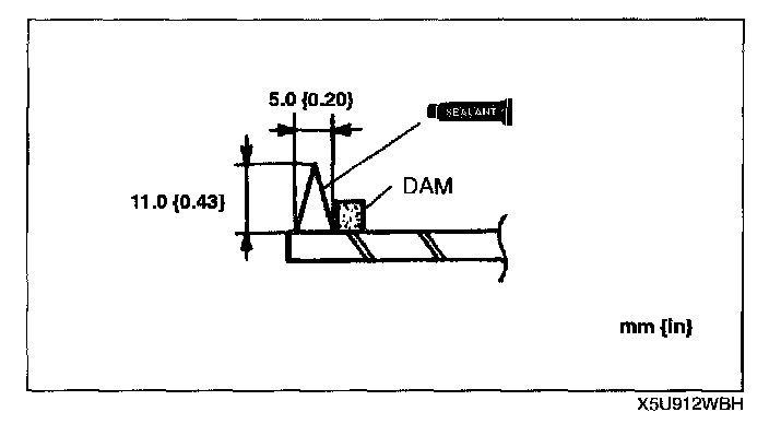11. Once the primer is dry, apply sealant around the entire circumference to fill the gap between the dam and the edge of the glass measuring 11.0 mm {0.43 in} high and 5.0 mm {0.20 in} wide.