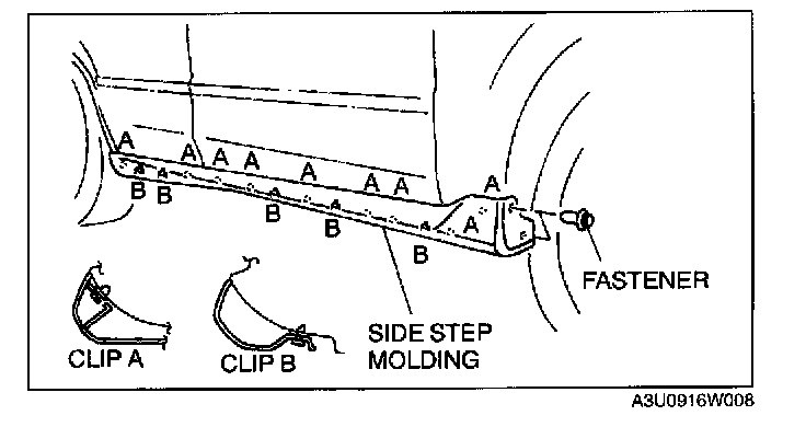 4. Disengage clips A from the vehicle front to remove the side step molding.