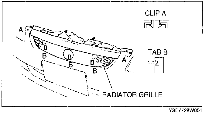 Pull the radiator grille forward to disengage clips A and tabs B from the front