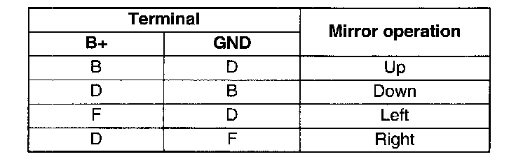 2. Apply battery positive voltage to the power outside mirror and inspect the operation of the power outside mirror. If not as specified, replace the power outside mirror.