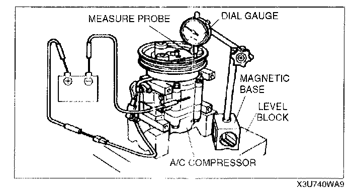 4. Turn off the magnetic clutch by disconnecting the ground from the A/C compressor body, then measure the dial gauge readings.