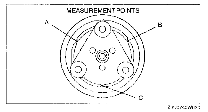5. Measure the clearance for points B and C on the pressure plate surface by repeating the above Steps 2 through 4.