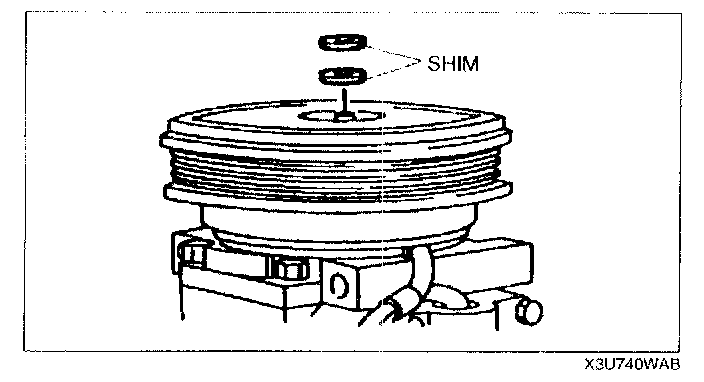 - If not within the specification, remove the pressure plate and adjust the clearance by changing the shim (0.2 mm {0.008 in}, 0.5 mm {0.02 in}) or the number of shims. (See MAGNETIC CLUTCH DISASSEMBLY/ASSEMBLY.)