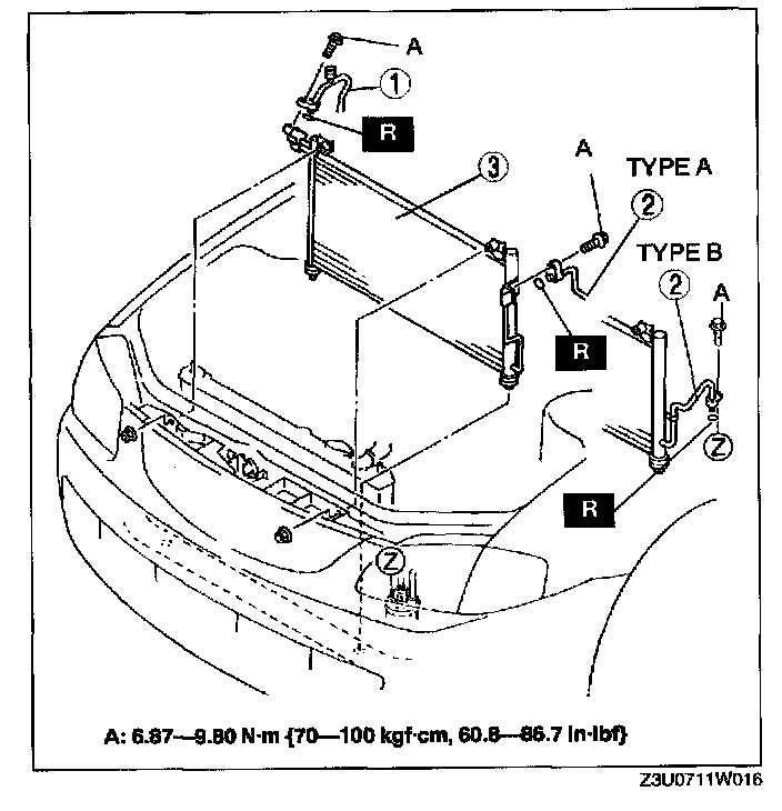 2. Cooler pipe No.1 (type A) or outlet pipe of condenser (type B) (See Refrigerant Lines Installation Note)