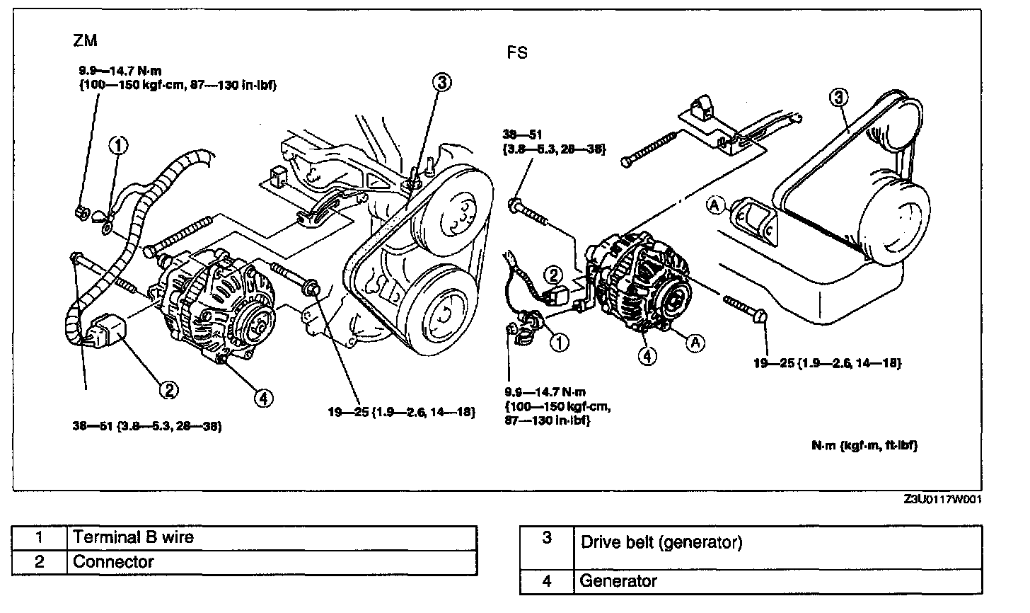 GENERATOR REMOVAL/INSTALLATIONWARNING: When the battery cables are connected, touching the vehicle body with generator terminal B will generate sparks. This can cause personal Injury, fire, and damage to the electrical components. Always disconnect the battery before performing the following operation.