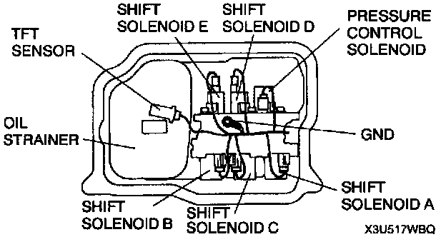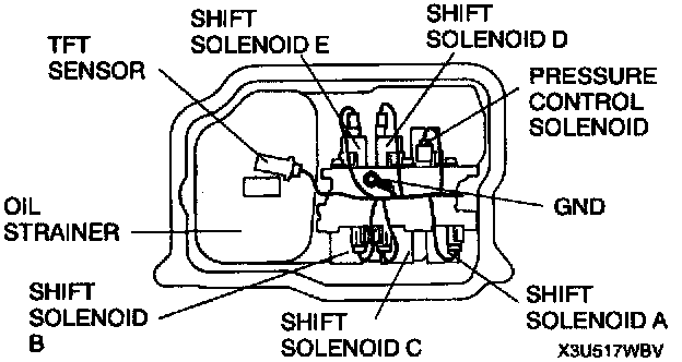 5. Disconnect the solenoid connectors and TFT sensor connector and GND.