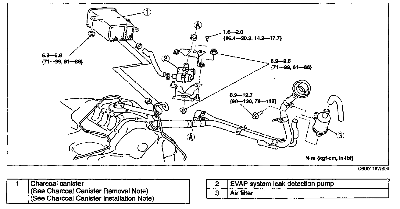 - For California emission regulation applicable model, refer to the "Evaporative Hose Removal Note" to disconnect evaporative hose (to the fuel tank) from the charcoal canister. (See Evaporative Hose Removal Note (Type B).)