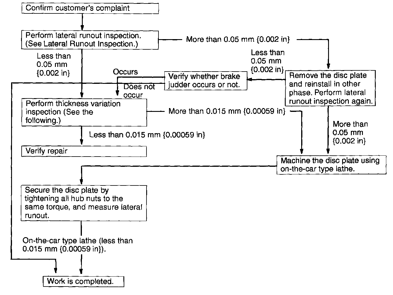 1. If the runout is more than 0.05 mm (0.002 inch) 10 mm (0.39 inch) from the disc plate edge, an uneven wear occurs on the disc plate because the pad contacts the plate unevenly.