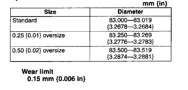 3. If the cylinder bore exceeds the wear limit, replace the cylinder block or rebore the cylinder and install the oversize pistons so that the specified piston-to-cylinder clearance is obtained.