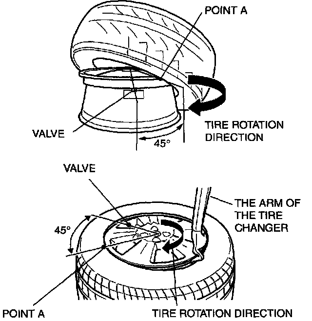 3. Set the tire changer so that it is 450 away (point A) from the valve hole.